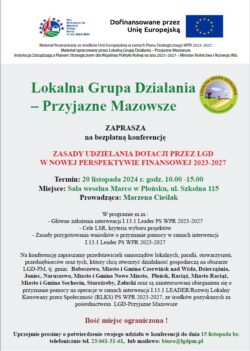 Zapraszamy mieszkańców obszaru LGD-Przyjazne Mazowsze na bezpłatną konferencję nt. Zasad udzielania dotacji przez LGD w nowej perspektywie finansowej 2023-2027.